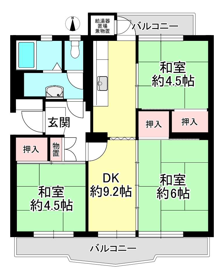 | 間取内容 | DK9.2畳 1室 和室6畳 1室 和室4.5畳 2室 | ||